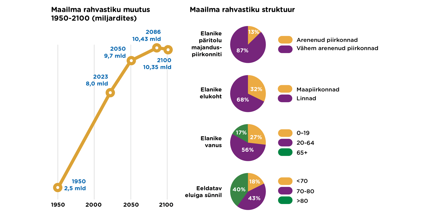 Sündimuse languse tõttu aeglustub maailma rahvaarvu kasv järgmistel kümnenditel veidi. Aastal 2050 elab meie planeedil 9,7 miljardit inimest – praegu (2025) on neid 8,2 miljardit. Kasv erineb märkimisväärselt riikide rühmade ja piirkondade ning mandrite lõikes. Kui enamikus arenenud riikides elanikkond väheneb ja vananeb, siis paljudes arenevates ja tõusva majandusega riikides jätkub endiselt kiire kasv. Kõige tugevam on kasv Aafrikas, samal ajal kui Euroopa rahvaarv väheneb. Rahvarikkaimaks mandriks jääb Aasia; suurimad riigid aastal 2050 on India, Hiina, Nigeeria, USA ja Pakistan. Madala sündimuse tõttu vananeb paljudes tööstusriikides ühiskond kiiresti. Nende suundumuste taustal on ka maailma rahvastiku eluea kasv, mis on vahemikus 1900 (32 eluaastat) kuni 2023 (73 eluaastat) enam kui kahekordistunud25.
