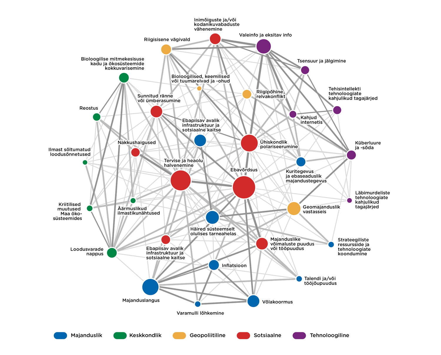 2. Poliitika ja valitsemine. Efektiivne poliitika peab arvestama üleilmseid riske, nagu kliimamuutused, loodusõnnetused ja elurikkuse kadu. Globaalse koostöö saavutamine muutub keerulisemaks, kuna võtmerollis olevad riigid näevad üksteist üha enam rivaalide, mitte partneritena. Autokraatlikud tendentsid kasvavad ka demokraatiates endis. Lühemas vaates mõjutavad poliitilist stabiilsust majanduslikud ja geopoliitilised riskid, kuid pikemas vaates tõusevad esikohale kliima- ja loodusprobleemid. Liberaalsete demokraatiate arv on viimase kümnendi jooksul vähenenud, autokraatlike riikide arv kasvanud, samas kui rahulolematus valitsemisvormidega on osas riikides tõusnud.